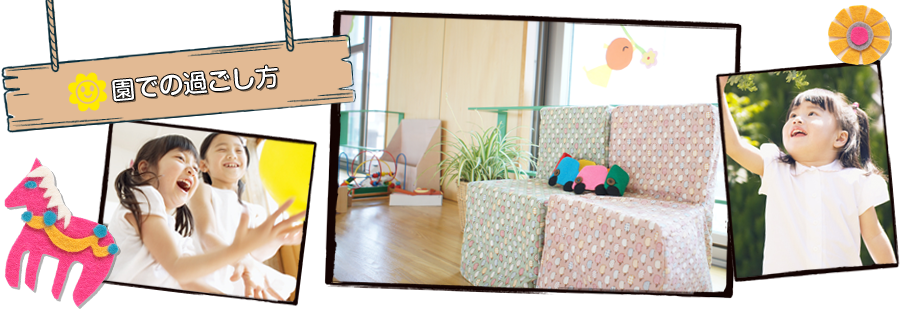| 8:30 | 平常保育(視診・自由遊び) クラス活動 ※(お庭で遊ぶ・リズム遊び・制作遊びなど) |